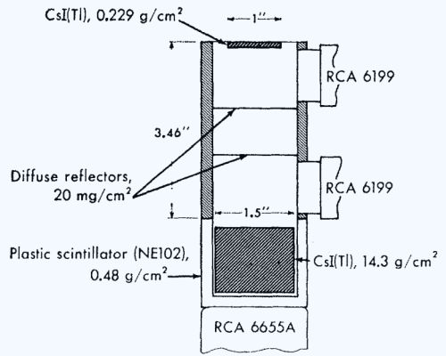 The technique utilized to detect and identify the particles was to make dE/dx and total-energy measurements on each particle. Such measurements serve to identify the type of particle as well as to measure its energy. For this purpose three optically separate scintillation phosphors were used. The detector is shown in cross section in the figure at left. The top thin crystal, viewed only by the top photomultiplier tube, made the dE/dx measurement. The total-kinetic-energy measurement was made by the lower cesium iodide crystal viewed only by the lower RCA 6199 tube. In addition there was a plastic phosphor, optically sealed from the total energy crystal, which was viewed by the RCA 6655A tube. By a coincidence-anticoincidence arrangement, acceptable particles mere required to pass through the top crystal and stop in the lower crystal. Pulse-height information from the two cesium iodide crystals was telemetered and recorded in digital form at the ground receiving station.