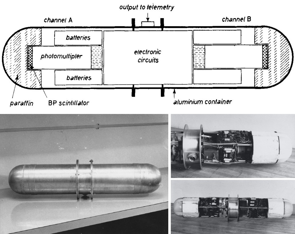 By the italian part, the objective was to measure the flux of low neutrons employing a detector based on boron-plastic scintillator counters. At left we can see an image and scheme of the fast neutron detector. It consisted of two boron-plastic scintillator discs, A and B, each fitted in a paraffin block (to slow down the neutrons) and viewed by photomultipliers. Disc A contains boron enriched to 92 % in 10B isotopes while B is of natural boron (4 % 10B). The electronic circuits were lodged between the bases of the two photomultipliers. Twenty-four Ni-Cd cells with a 0.9 ampere-hours capacity were situated around the photomultipliers. These were capable to provide sufficient power for 14 hours of operation.