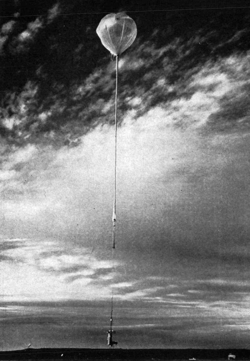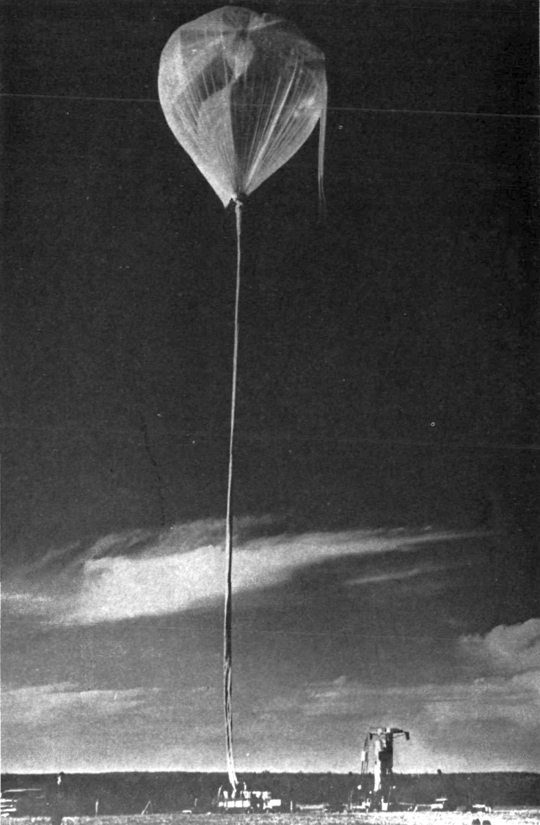 In planning Stratoscope II, one of the prime considerations was to construct a balloon strong enough to lift such a heavy weight to the required altitude of 80,000 feet. Polyethylene film, commonly used for balloons, was then limited to a load-carrying capacity of about 4,000 pounds, and thus was unsatisfactory for the project. To meet this problem, the G.T. Schjeldahl Company of Northfield, Minnesota under contract to ONR, developed a reinforced laminated plastic film having high tensile strength and tear resistance. Schjeldahl also developed, a new balloon system capable of lifting the heavy telescope payload off the ground quickly while remaining unbuffeted by ground winds as high as 15 knots. The system employed two balloons -a small one and a large one, with the former mounted on top of the latter. The small balloon was composed of a 0.5 mil Mylar and dacron laminate called S-12 with a volume of 250,000 cubic feet. The main balloon consisted of a 0.3 mil Mylar and dacron material known as S-11 with a volume of 5,250,000 cubic feet. The two balloons were connected by a 2-1/2 foot metal tube, 3 feet in diameter, attached to a 3-foot hole in each balloon.