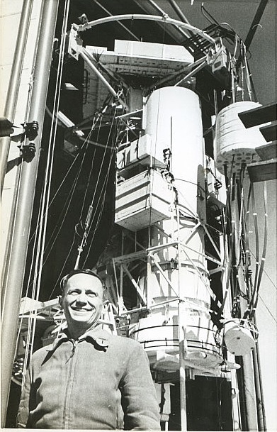 The L-section, weighing 5.500 pounds, was supported by the "knuckle" which contained the drives and the axes that allowed the telescope to point higher or lower in the sky (elevation) and to rotate along the axis of its tube (roll). The L-section and knuckle were supported by the azimuth bearing, which allowed freedom to turn around the vertical axis (azimuth). The telescope was moved to any required elevation angle by a motor-gear drive, but during tracking operated within the freedom of +50 flexure bearings in both roll and elevation. The azimuth bearing was a mercury-floated type wherein the telescope was floated by the buoyant force of a pool of mercury. The telescope tube was locked vertically against the azimuth frame during launch. After deployment, it had a viewing range extending from 70º down to 20º above the horizontal over an azimuth of 360º. A 14-foot diameter inertia ring was fastened to the top half of the azimuth frame. That ring supported the batteries which powered the instrument, ballast containers, provided the counter-inertia in azimuth and finally served to absorb part of the shock of landing at the end of the flight.