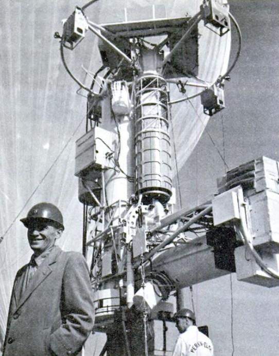 At left we can see a basic scheme of the telescope as deployed in-flight (click to enlarge) and the configuration of the double-balloon tandem system (more details below). The assembly consisted of an 18-foot main tube and an 11-foot side arm which together formed a fixed L-shaped structure. The basic telescope was housed in the main tube with the objective mirror, the secondary mirror, which was also the focusing element, and a television camera with a 10º field, used to locate the general section of the sky to be studied. The side arm assembly housed the guidance package, camera equipment, and another television camera, this one with a 1º field, which looked through the reflecting telescope and fixed the specific celestial object to be photographed. At its core was a 36-inch diameter optical mirror fabricated by the Corning Glass Works from New York. Fused silica was choosen as material for the mirror because it was unaffected by the sharp changes in temperature the telescope experienced in flight. That was the first time a fused-silica blank of that size was successfully formed and with high accuracy to a true parabolic shape.