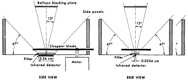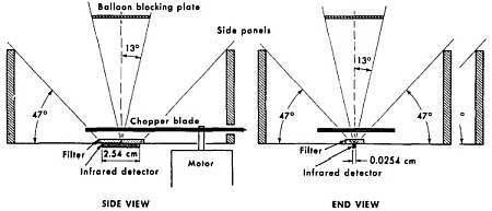 An uncollimated NaI scintillation counter, 2,54 cm in diameter by 1,27 cm in height, was used for the detection of X-rays. A three channel integral pulse-height analyser was used to obtain the counting rates for all X-rays of energy greater than 25, 50 and 100 keV. A lead sulfide photoconducting detector -which was covered by a Corning 7-57 glass filter in order to block visible radiation- measured the integrated intensity of infrared radiation from the sky. It was necessary to interrupt periodically the radiation striking the detector in order to obtain a usable signal-to-noise ratio; a rotating chopper blade was used for this purpose.