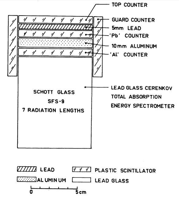 The detector system which can be seen in the image at left was standardized to ensure consistent data acquisition across different experiments. The configuration included five scintillation counters and a lead-glass Cherenkov counter providing a total of seven radiation lengths of material. The lead-glass counter detected Cherenkov radiation, enabling precise measurement of particle energy. The scintillation counters, arranged in layers, recorded the passage of charged particles and facilitated the discrimination between protons and electrons. A lead layer was included to initiate cascade showers in electrons, while a thin aluminum layer helped differentiate nuclear interactions from electromagnetic processes. The pulse-height information from each counter was telemetered digitally to ground stations.
