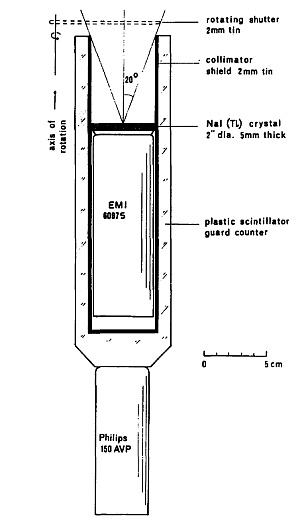 The detector system can be seen in the scheme at left. It consisted of a 2-inch sodium iodide crystal (NaI(Tl)) with a thickness of 5 mm. This crystal was housed inside a cylindrical cup made of tin with 2 mm wall thickness, which served both as a collimator and shield. The cup defined a geometrical factor of 8 cm² steradian for X-ray detection, with a half angle of 20 degrees. The entire detector assembly was surrounded by a plastic scintillator that functioned as a guard counter, designed to reject background events associated with charged particles. The guard counter's anti-coincidence threshold was set at 200 keV.