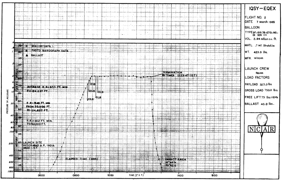 The system ascended at an average rate of 862 ft/min to 50,000 ft and a rate of 848 ft/min to 124,600 ft for an overall average ascent rate of 853 ft/min. Duration at altitude was 3.5 hr. Descent time was 31 min with impact at 160 48' N, 780 45' E. Recovery was successful and the crew returned to Hyderabad the same afternoon. The balloon barotransmitter indicated an irregular floating altitude, fluctuating from 110,000 to 103,000 ft and back to 107,000 ft. At the time this irregularity was not understood; however, on examining the Raven photobarograph, it was in agreement with beacon data. On the other hand, New York University's photobarograph indicated a pressure level of 3.95 mb, which was nearer the theoretical ceiling of the balloon.