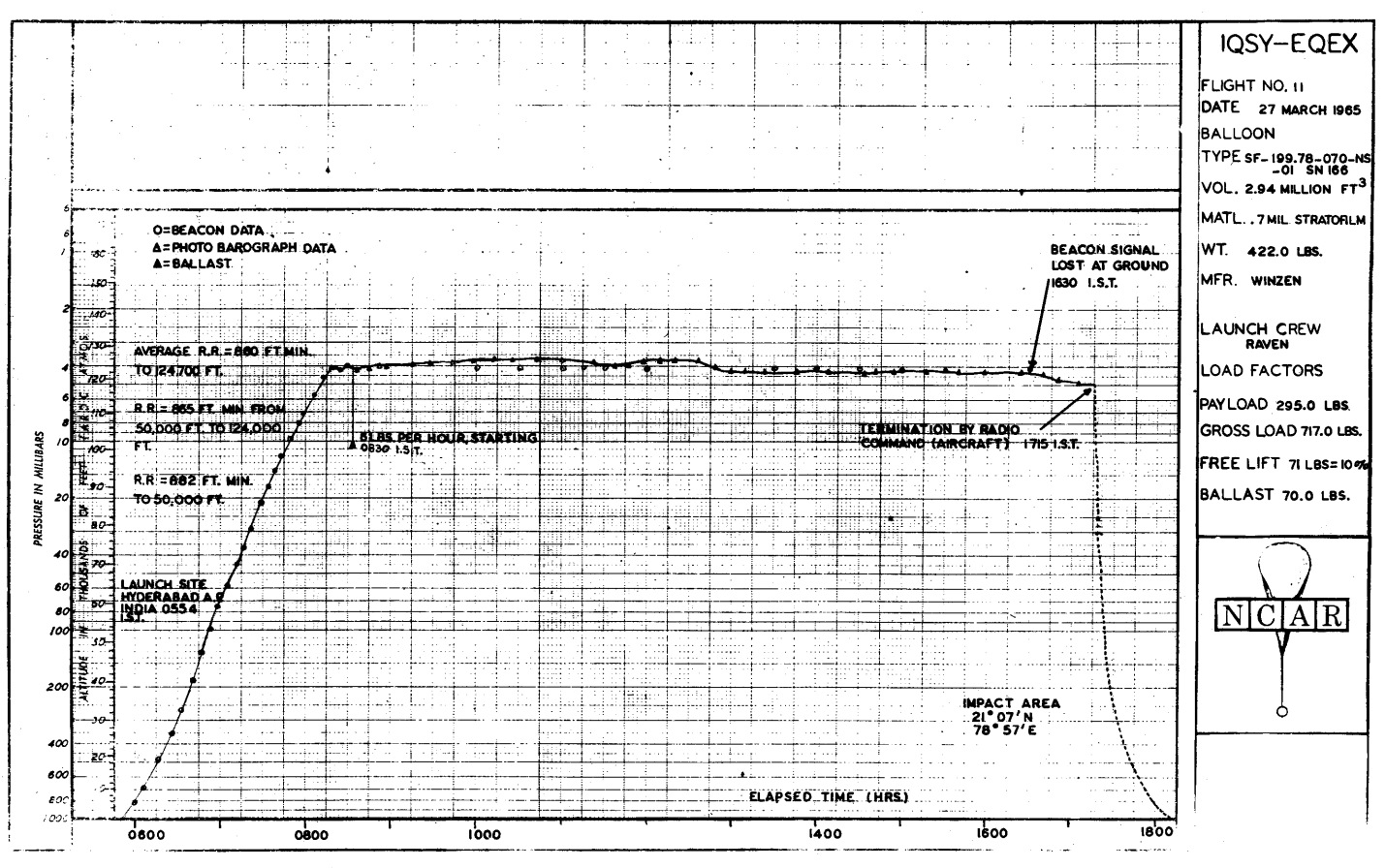 The balloon was released at 5:54 local time on March 27, 1965. The sphere and control instruments were gently lifted free of the launch cart while the ion chamber was hand launched. The antenna was released by radio command at 1,500 ft. While ascending at an average rate of 860 ft/min, to 124,000 ft, the balloon first went east, then took a northerly track. A float duration of 8.75 hr took the balloon to the west of Nagpur where the flight was terminated by radio command from the aircraft at 17:15 local time.