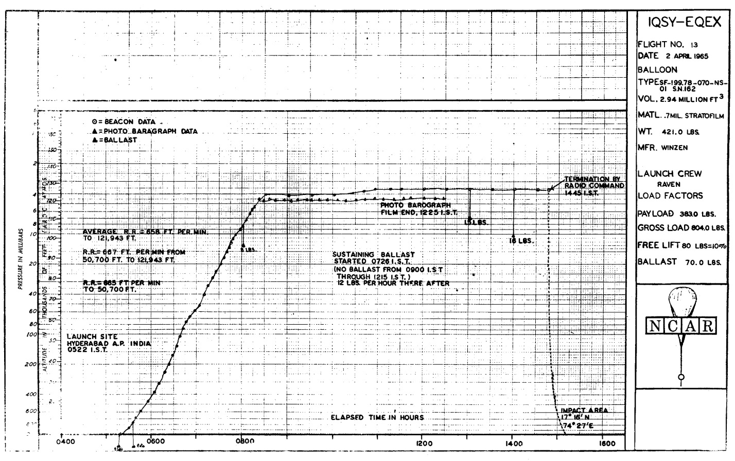 This flight was part of a balloon expedition to study cosmic rays in the vicinity of the equator during the International Quiet Sun Year (IQSY) organized and managed by the National Center for Atmospheric Research as a joint United States - India activity. The program was conducted in Hyderabad, India during the late winter and early spring of 1965.