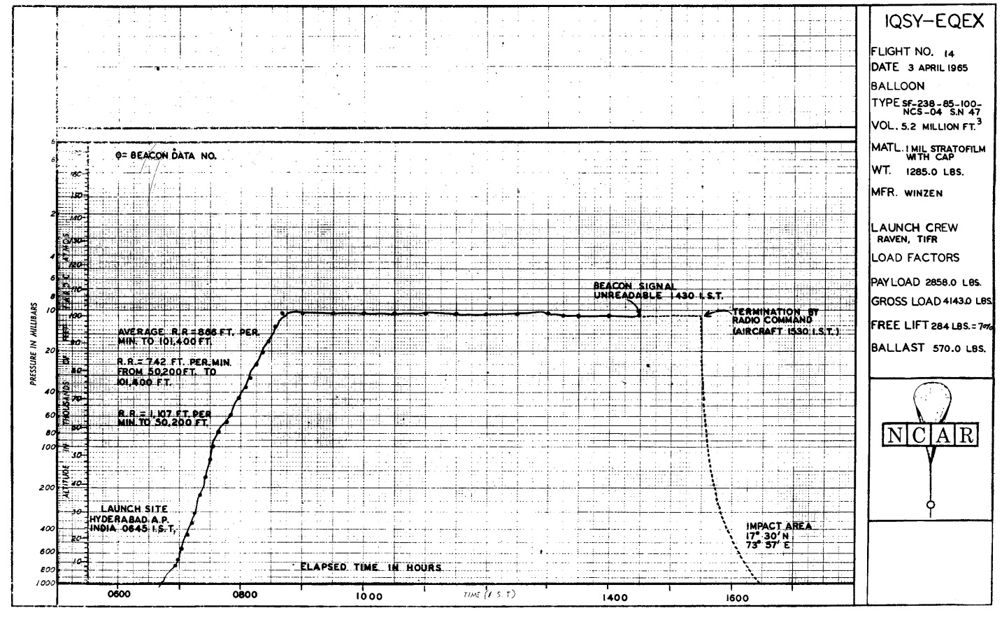 The flight was part of a balloon expedition to study cosmic rays in the vicinity of the equator during the International Quiet Sun Year (IQSY) organized and managed by the National Center for Atmospheric Research as a joint United States - India activity. The program was conducted in Hyderabad, India during the late winter and early spring of 1965.