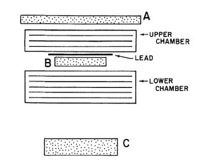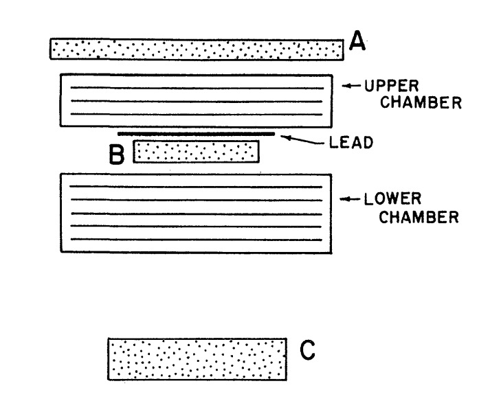 The detector used in the present balloon flight consisted of a scintillation-Cerenkov-counter system in conjunction with two spark chambers. Figure at left illustrates the essential geometry of the detector. The two plastic scintillators A and B, together with the Lucite Cerenkov counter, C, were used to trigger the chamber. The upper scintillator (A) was seven inches in diameter and half an inch thick and was viewed by a photo multiplier through a non-scintillating Lucite light pipe. The lower scintillator (B) was three inches in diameter, half an inch thick and was also viewed by a photo multiplier. The Cerenkov counter C consisted of a one-inch thick non-scintillating Lucite disc four and a quarter inches in diameter viewed directly from below by a photo multiplier. The upper surface of the Lucite was blackened to make the telescope sensitive only to particles traversing the counter in the downward direction.