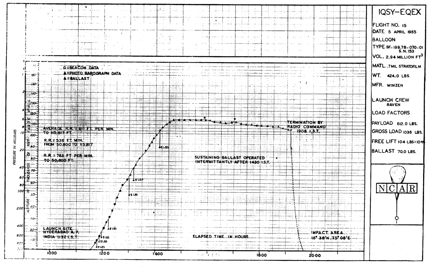 After some delays, the balloon was launched at 11:32 local time on April 5, 1965. Just after balloon release, a technician reported having seen a hole near the top of the balloon as it ascended. A quick check of the ascent rate indicated a slower than normal ascent rate. Ballast was immediately expended in an effort to get the balloon quickly to altitude where a small hole would become insignificant. Approximately 76% of the available ballast was expended. Due to this, the balloon reached an altitude of 119.000 ft and steadily dropped altitude until cut-down, when it was at 114.000 ft four hours and 35 min later. During the flight the balloon drifted from nearly overhead of Hyderabad, India to near Athni, India. The instrument was switched on at 14:00 local time when the balloon was ascending and was at 103.000 ft. The detector was active throughout the whole flight. During the period at altitude the detector recorded a total of 392 gamma rays.