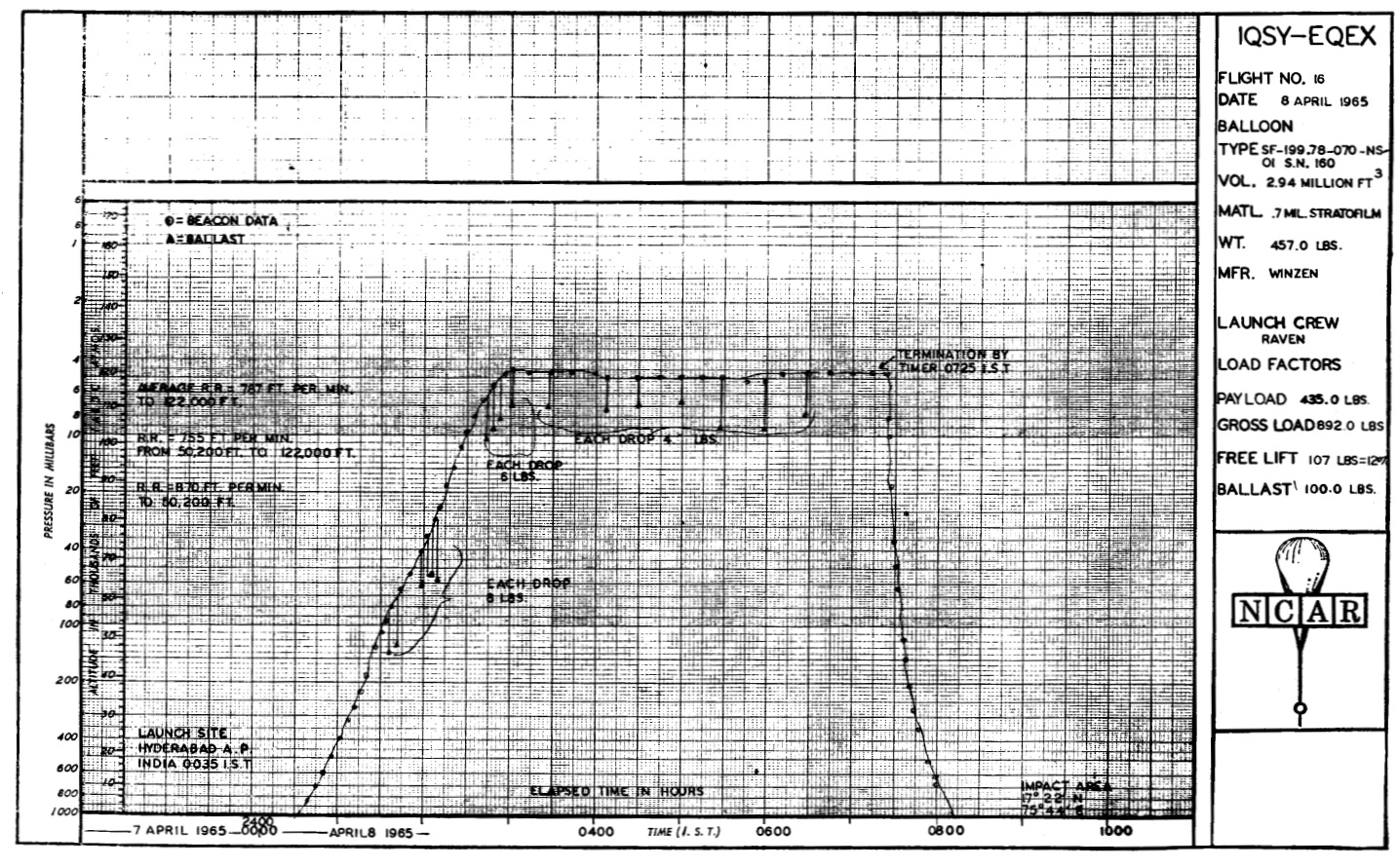 All balloons launched on the expedition had been launched late enough in the morning to reach altitude after sunrise; however, this particular experiment required an early launch so the experiment could be at altitude before sunrise. Numerous balloons flown in India had passed through tropopause temperatures of -75 to -83 C during a sunlight ascent, without bursting. There was some concern about whether or not a balloon could successfully reach altitude through a -81 C tropopause temperature in total darkness. Since the ascent was in darkness, an additional 2% free lift was used. An additional 30 lb of ballast was used to increase the ascent rate in the event the balloon stopped at the tropopause. With the help of lights from the various trucks and cars at the launch site, the balloon was launched at 00:35 local time on 8 April. An ascent rate of 870 ft/min was established to 50,200 ft and 755 ft/min to an altitude of 122,000 ft. After 4.5 hr at ceiling, the flight was terminated. Impact occurred at 170 22' N, 750 44' E. The telescope sustained no damage on impact and could be flown again after a routine check.
