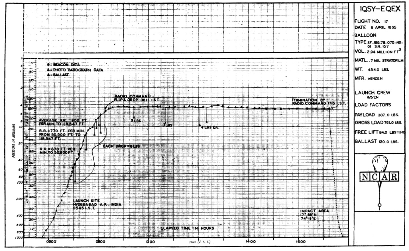 This flight was part of a balloon expedition to study cosmic rays in the vicinity of the equator during the International Quiet Sun Year (IQSY) organized and managed by the National Center for Atmospheric Research as a joint United States - India activity. The program was conducted in Hyderabad, India during the late winter and early spring of 1965.