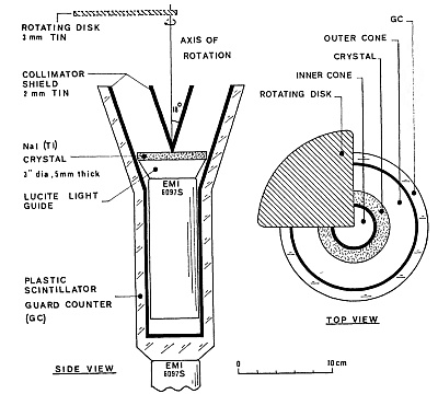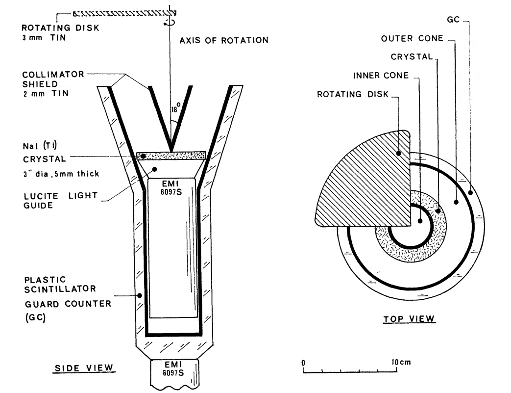 The detector -that we can see in the scheme at left- consisted of a sodium iodide (NaI) crystal, 75 mm in diameter and 5 mm thick, coupled to a photomultiplier assembly. This assembly was mounted inside a cylindrical tin cup with 2 mm thick walls that provided shielding against background X-rays. The collimator was made of two coaxial tin cones (2 mm thick) with an 18-degree half-angle at the top, corresponding to the zenith angle of Cyg XR-1 at its meridian passage at their latitude of 52° N. The inner surfaces of both the cup and collimator were covered with 0.3 mm thick copper foil to absorb K-X-rays potentially generated in the tin. The maximum effective area for source detection was 26 cm².