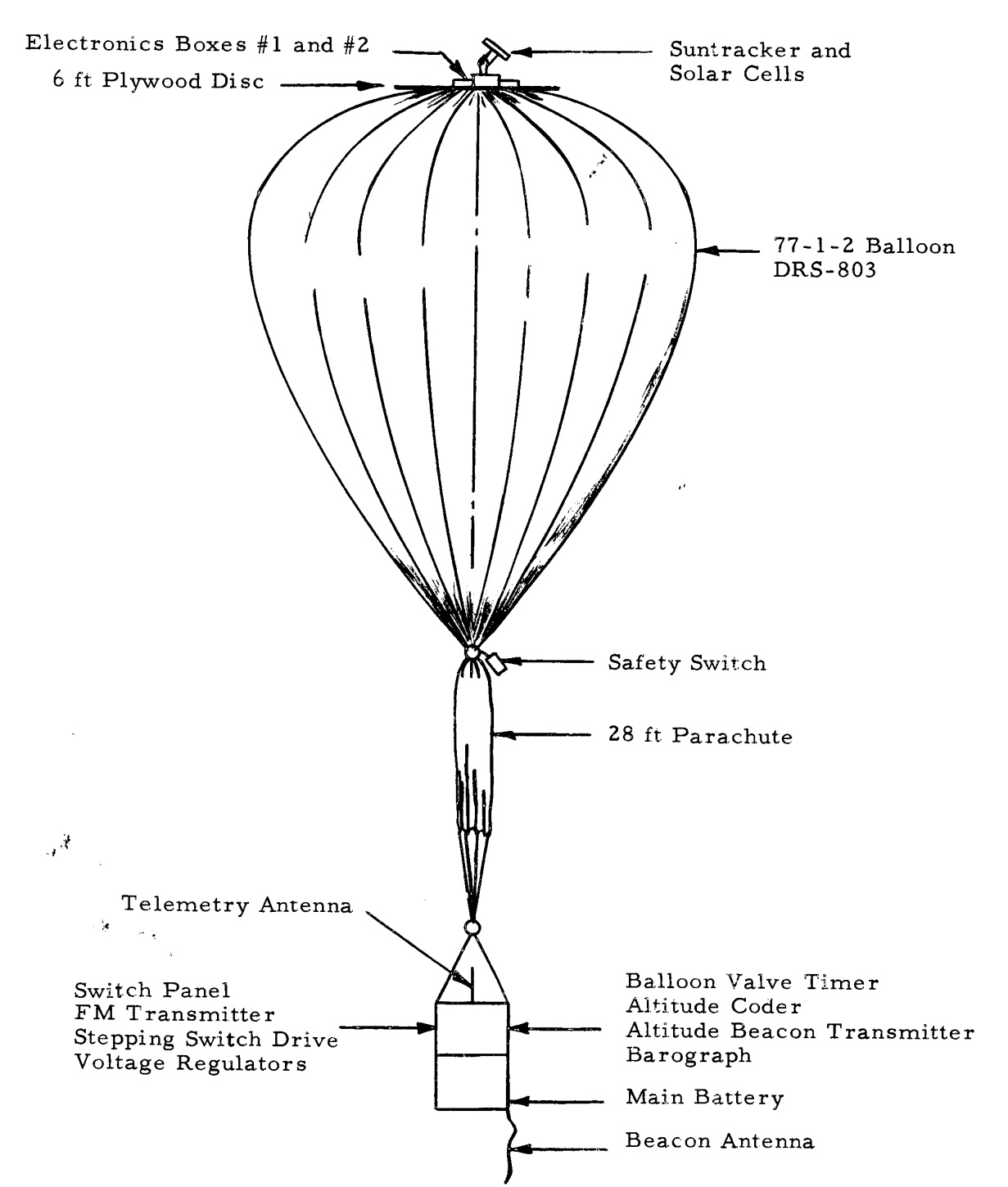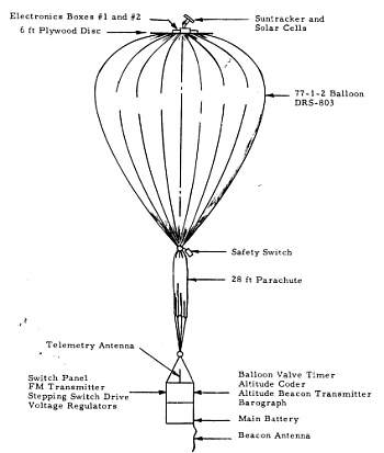 Althought some modifications were introduced over time, the main components of the balloon flight system were maintained along the entire program: a sun tracker, a helium-filled balloon, a telemetry system, and a battery power supply, as shown in the scheme at left (click for more detail). The sun tracker was mounted on the balloon apex, which is the most stable position of the balloon system. The telemetry transmitter and battery power supply, along with several instruments for measuring altitude, were suspended in a second gondola beneath the balloon. An electrical cable, incorporated into the balloon during manufacture, connected the top and bottom payloads.