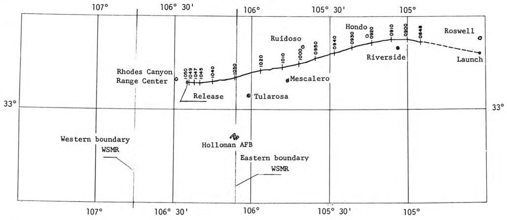 After launch the balloon take a southerly path and passed over the Sacramento Mountains. Then flown over the White Sands Missile Range, and when the balloon was 3 miles northwest of the center of the so called "50 mile area" the Aeroshell was released.