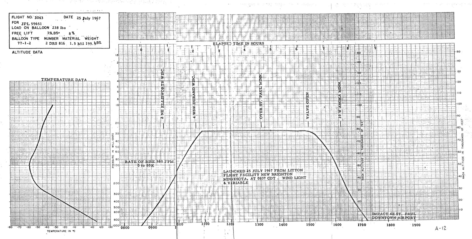 The balloon was launched by dynamic method from the Litton Flight Facility located near New Brighton, Minnesota at 8:37 CDT on July 25, 1967 as Flight No. 3043. The balloon ascended on a sbutheasterly course and reached float equilibrium over Durand, Wisconsin at 10:55 CDT. The wind at float altitude moved the balloon to the northeast over St. Paul and to a point 3 miles north of Rockford, Minnesota at 15:00 CDT, the conclusion of the float period.
