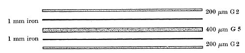 Iron was used as the degrader in preference to lead because, in a thin detector, the disadvantage of the shorter interaction length in iron is outweighed by its somewhat greater stopping power, and the consequent weight reduction. The outer two emulsion layers were composed by Ilford G2 layers, with a thickness of 200 µm. The central emulsion was an Ilford G5 plate, with a thickness of 400 µm. The outer emulsions permitted to select those particles Which penetrated the entire assembly and to check for any variation of ionization with range in the detector. The sensitivity of the G2 emulsions was approximately 20% of that of the G5 emulsions and enabled to measure the central optical density of the heaviest detected tracks.