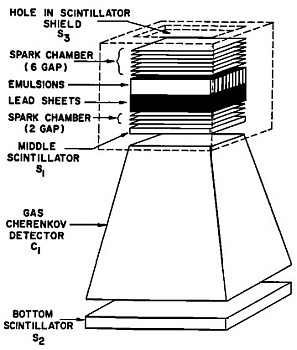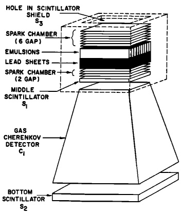 A schematic diagram of the detector is shown in the figure at left. The geometry of the telescope was defined by the middle scintillator S1, the gas Cherenkov counter C1, the bottom scintillation S2, and a hole cut in the anticoincidence shield S3. These elements give a factor of 38 cm2 ster after correcting for non usable portions of the emulsion stack. The major detector element is the stack of emulsions (Ilford G-5) flanked on top and bottom by two thin-plate spark chambers with 6 and 2 gaps, respectively. The top spark chamber picture is used to locate the primary track entering the emulsions; the bottom chamber picture reveals whether the primary has produced an electromagnetic or a nuclear interaction in the emulsion stack. The emulsion block consisted of a vertical stack 49 X 12.6 X 6.5 cm and horizontal steel-emulsion-lead sandwiches, making up a total of 6.5 radiation lengths (rl). A triple coincidence between S1, C1, and S2 with no S3 triggers the spark chambers, and a camera takes stereoscopic pictures using folded optics.