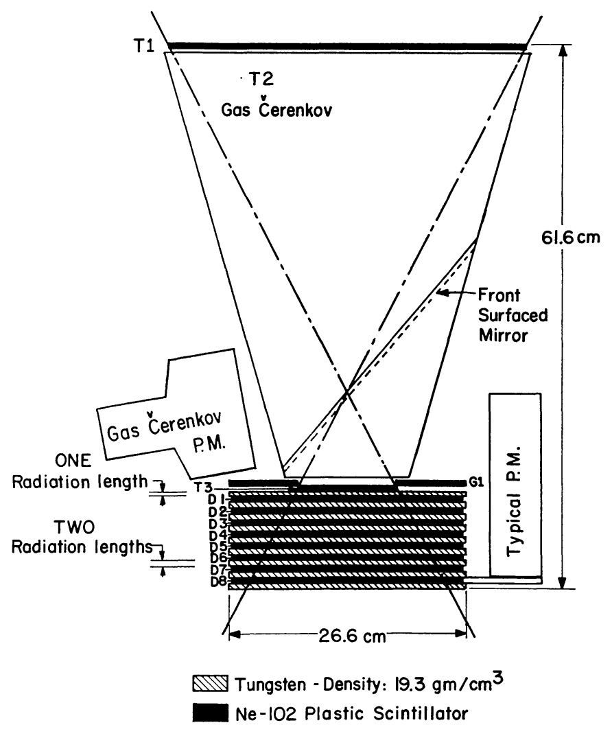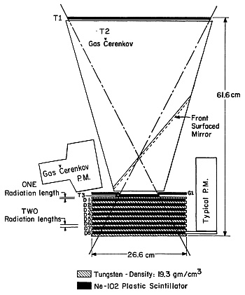 The spectrometer section comprised nine tungsten plates interleaved with eight plastic scintillation counters (D1 through D8). This arrangement formed a 15 radiation-length-deep absorber, capable of producing and measuring cascade showers from incoming electrons. The tungsten plates varied in thickness, with the first being approximately one radiation length and the others around two radiation lengths. Electron-photon cascades produced in the tungsten were measured at various depths, yielding shower profiles indicative of the primary electron's energy.