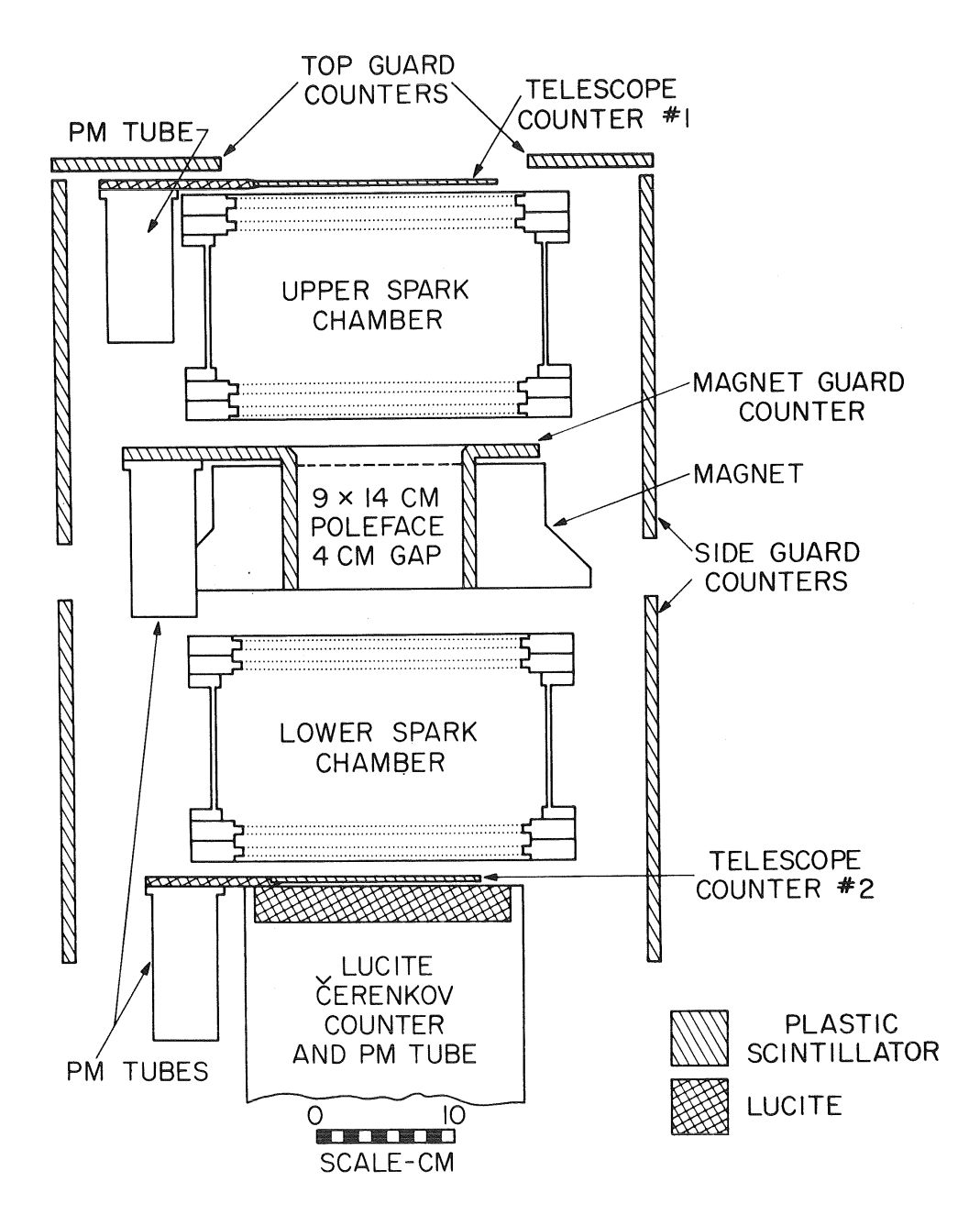 The Lucite Cerenkov counter was designed to discriminate against upward-moving splash albedo particles and to eliminate the nucleonic component of the cosmic rays in the rigidity interval of interest. The specially designed Magnet Guard Counter covered the top of the magnet and completely lined the gap volume leaving a 3-cm x 12-cm open passage. That guard counter eliminated particles which might interact or scatter in the magnet pole pieces and, together with Tl and T2, defined the acceptance cone of the detector. Additional guard counters surrounded the sides of the instrument and covered the top with the exception of the telescope aperture. These counters eliminated charged particles which entered the detector from outside the acceptance cone and might subsequently interact, producing particles which triggered the telescope counters. All guard counters were in active anti-coincidence.