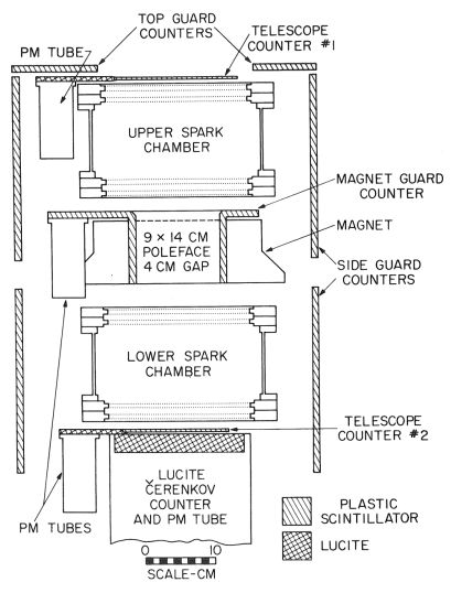 In the figure at left we can see a basic scheme of the detector used between 1968 and 1969 (click to enlarge). It consisted of a magnetic spectrometer utilizing a 1000-gauss permanent magnet, scintillation counters, and a lucite Cerenkov counter. A triple coincidence of Telescope Counter #1 (Tl), Telescope Counter #2 (T2), and the Lucite Cerenkov Counter (C), triggered the spark chamber high voltage and initiated the data readout cycle. Two 4-gap wire spark chambers determined the trajectory of the particle before and after traversal of the gap of a permanent magnet. The spark locations were detected by magnetostrictive pickups and recorded in digital form on magnetic tape.