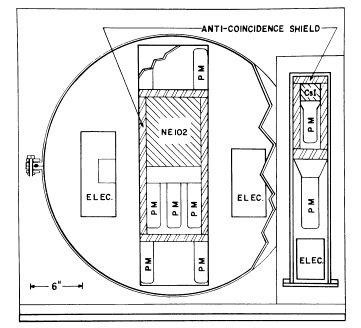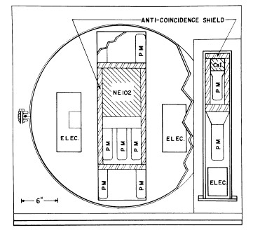 The operation of the two detectors, except for common low voltage power supplies and the recording system, was completely independent. Each detector along with its complete electronics circuitry and high voltage DC-DC converter was in its own pressurized container. The rates from the three integral level discriminators and the charged particle shield of each detector were electronically sealed and recorded on photographic film. A clock pulse and the temperature in each pressure shield were also recorded during the flight. The total thíckness of matter between the basic neutron or gamma ray detectors and the atmosphere was 4 to 5 g/cm2 and consisted of the plastic charged particle shields, fiber glass pressure containers and polystyrene thermal insulation.
