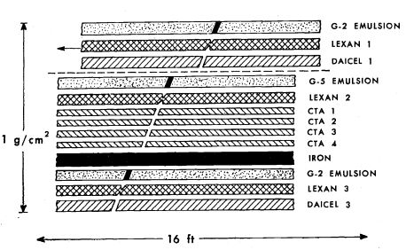 The payload was composed by an stack of plastics, emulsions, and iron absorbers. The figure at left show the composition of the stack. The upper portion of it contained a motor-driven, shiftable layer of G-2 emulsion + Lexan polycarbonate + Daicell cellulose nitrate so that events occurring at ceiling altitude could be singled out. The iron slab was inserted to bring the total thickness to 1 g/cm2 so that tracks of nuclei with velocity much less than that for the geomagnetic cutoff on which the balloon flew, could be easily recognized and discarded.