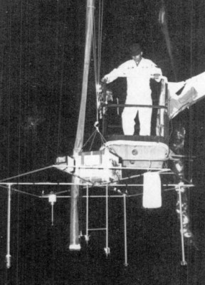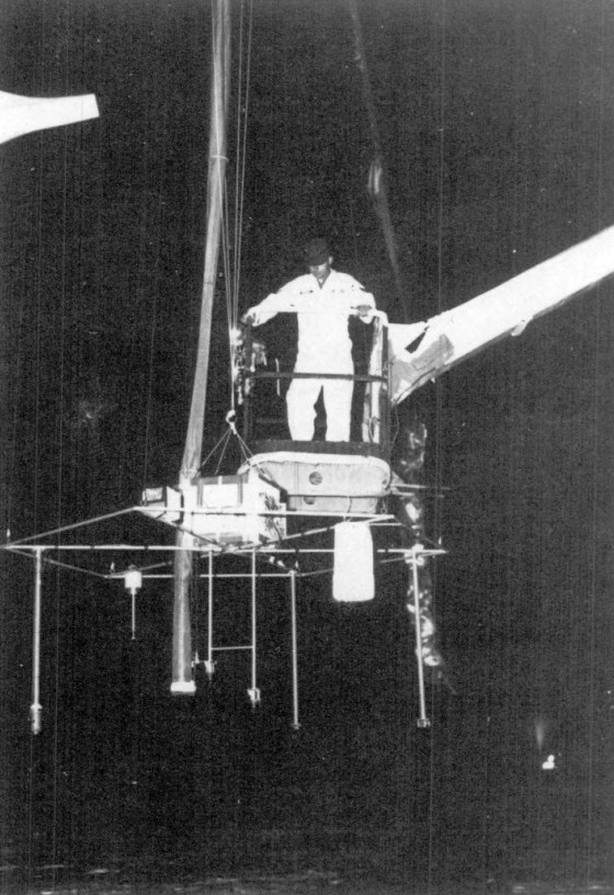 The experiment required a supporting frame for six atmospheric sensors with their associated power supplies and telemetry systems with a weight limit of 75 pounds. The payload which can be seen in the picture above consisted of an aluminum frame and ballast exit, a central battery power supply and sensor modulation circuitry, two 1680 MHz transmitters, and six atmospheric sensors with their associated mountings. Yardney silver cell batteries were used to provide power during the flight. Due to the low temperatures expected during the flight the batteries were put in a box insulated with styrofoam sheets three inches thick and with a thermally controlled heater. This box also contained the various electronic circuits for the atmosphere sensor payload.