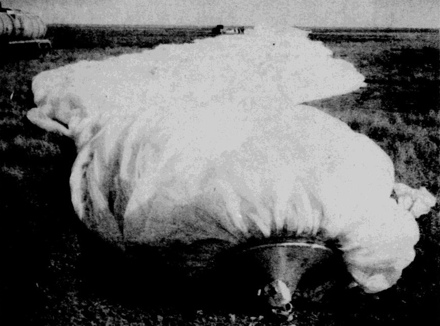The balloon flight was attempted on November 6th, 1969 from the Holloman Air Force Base in Alamogordo, New Mexico. Everything went as per schedule and procedure. The reel up of the tow balloon was uneventful. Cable drop from the transfer duct was issued and the cable and hardware smoothly dropped down. Balloon was airborne at 8:30 CST. The scientific payload was intended to reach an altitude of 108,000 feet, where it would float for roughly 24 hours, however trouble was detected when the system reached an altitude of 60,000 feet. At that moment the ascent rate of the balloon slowed down and after a few minutes it began to descend. To facilitate the descent, 47,000 pounds of ballast were jettisoned, allowing the system to lower to an altitude of 10,000 feet. From there, three 100-foot parachutes deployed, ensuring a safe landing of the 13,800-pound experiment 34 miles northeast of Roswell, New Mexico, at approximately 11:30 CST. The balloon itself touched down approximately 55 miles east of Roswell.