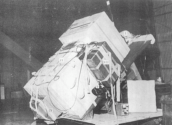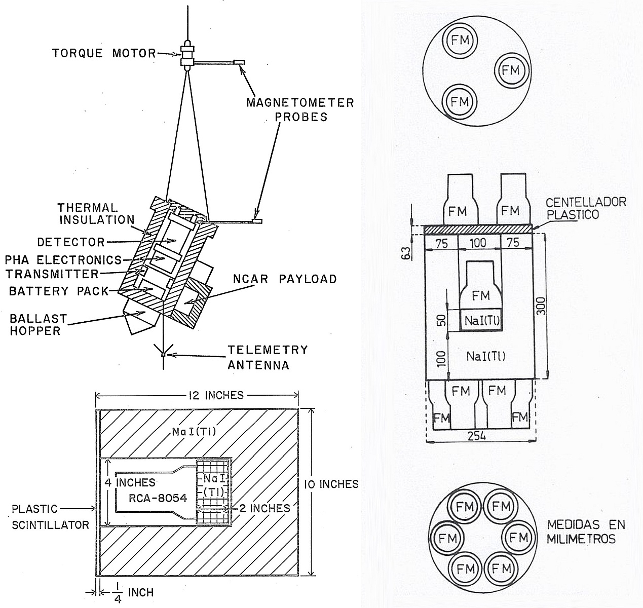 The detector was a Nal(Tl) scintillation crystal measuring 10 cm of diameter and 5 cm thick with a sensitive area of 75 cm, surrounded by a well-type guard crystal, also of Nal(Tl). The phototube viewing the central crystal is connected via anticoincidence circuitry to a 128-channel pulse-height analyzer, while the phototubes viewing the guard crystal supply the anticoincidence pulses. At left we can see an scheme of the system flown (click to enlarge).