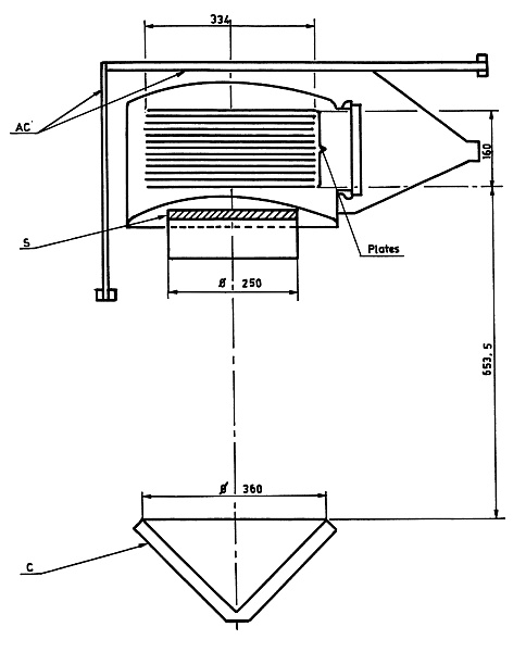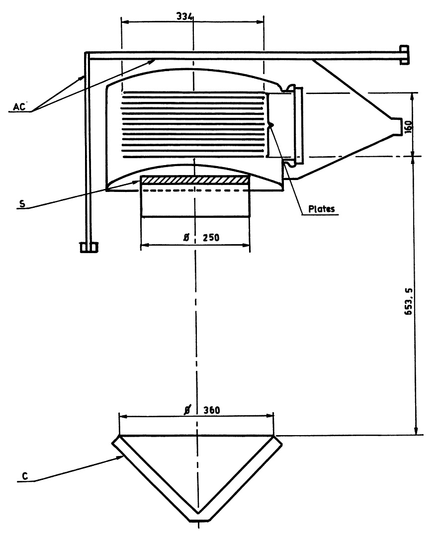 Each individual plate provided a surface area of 850 square centimeters and possessed an equivalent thickness of 0.033 radiation lengths. The construction of these plates involved two steel foils that were bonded together using a lightweight aluminum honeycomb structure, creating a robust yet sensitive detection medium. The twofold coincidence system incorporated a 500-square-centimeter plastic scintillator counter, designated as counter S, which was positioned directly below the spark-chamber assembly. Additionally, a directional 900-square-centimeter Cerenkov counter, labeled as counter C, was located 60 centimeters below counter S to provide additional discrimination capabilities.