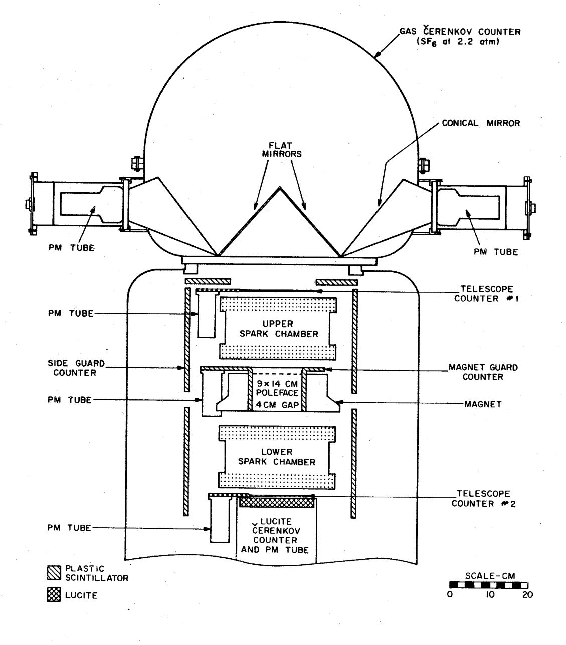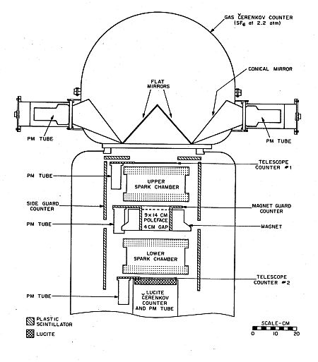 In the figure at left we can see a basic scheme of the detector used between 1970 and 1973 (click to enlarge). It consisted of a magnetic spectrometer utilizing a 2300-gauss permanent magnet, scintillation counters, a lucite Cerenkov counter and an additional gas Cerenkov counter. An ""event"" (observation of a charged particle) was defined by a triple coincidence between Telescope Counter (Tl), Telescope Counter (T2), and the Lucite Cerenkov Counter (LC), and the absence of a pulse from any of the guard counters. This coincidence produced the fast-gate pulse (FG) which triggered the high voltage to the spark chambers and initiates the data read-out cycle. The two 4-gap spark chambers were used to define the particle's trajectory before and after passing through the gap of the permanent magnet.