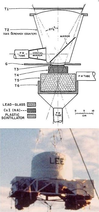 In the picture at left we can see a basic scheme of LEE and the instrument ready to flight on its gondola. The design remained intact since its inception with only minor upgrades made periodically. It consisted of a counter telescope made of NE 102 A plastic scintillators, a CsI(T1) scintillator, a gas Cerenkov counter, a lead glass Cerenkov counter, and a plastic penetration counter. Basically, the LEE instrument measured electron energies by causing incoming electrons to shower and recording the resulting signals from the shower counters. The maximum angle of acceptance was 27.5° from vertical, and the geometry factor was 18 cm2 sterad, defined by the two plastic scintillators T1 and T3. These two counters had diameters of 28 cm and 7 cm and thicknesses of 0.5 cm and 0.32 cm respectively. The gas Cerenkov counter T2 consisted of a conical container filled with Freon 12 at 2.5 atmospheres of pressure. The T1, T2, T3 coincidence was used to initiate the measuring process for each event.