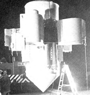The instrument's significant weight -9,500 pounds- necessitated the use of the largest balloon available at the time, which had a volume of 34 million cubic feet. This two-part interconnected system included a main balloon, surmounted by a smaller launch balloon. Both balloons were constructed of laminated Mylar plastic film reinforced with Dacron fibers. At launch, the smaller balloon was filled with 500,000 cubic feet of helium. As the system ascended, the expanding helium passed through a transfer duct (a collar-like ring connecting the two balloons) to fill the main balloon, which expanded to a final diameter of 731 feet.