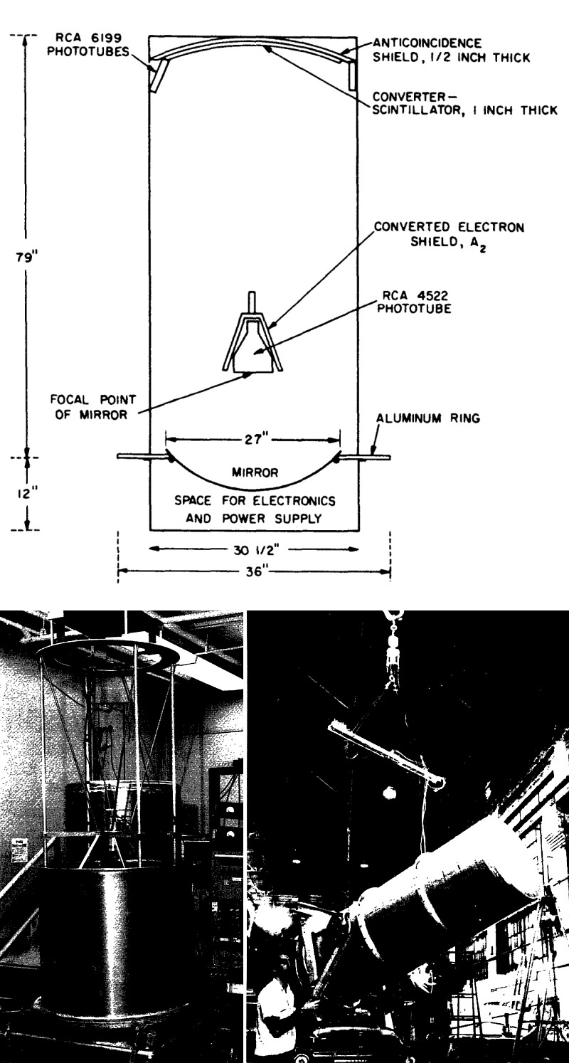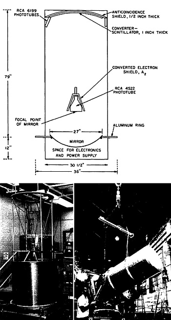 The Cerenkov light was focused by a large, metallic, rhodium-coated mirror onto a 5-inch RCA 4522 photomultiplier tube. The mirror had a focal length of 24 inches and was originally a surplus searchlight mirror, selected for practical reasons despite its weight. The Cerenkov radiator was filled with propane gas, chosen for its low electron multiple scattering and sufficient light emission, offering an optimal balance between detection efficiency and angular resolution. The gas pressure was adjustable to vary the energy threshold during flight, enabling the measurement of gamma rays above different energy levels.