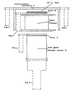 At left can be seen a scheme of the detector. Half a radiation length of lead was used to convert the incoming gamma-rays into e+/e- pairs. The electronic logic for a gamma-ray was ABCD, and all events of this type which exceeded the discriminator level of D (>50 MeV) triggered the spark chamber gaps S1 and S2 and enabled the pulse height information from D to be read out. The spark chamber was of the multi-wire grid type. The spark location was determined using the magnetostrictive wire technique and the coordinates were read out in a digital form. The angular resolution of the detector was limited by multiple Coulomb scattering in the converter material at the lower energy end of the spectrum and by the spark chamber geometry at the higher energies; it ranged from 5º at 200 MeV to 3º at 1 GeV and above.