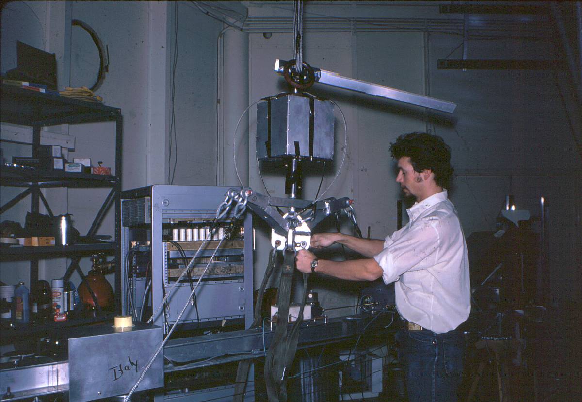 The instrument was formed by a big cilinder measuring 100 inches of diameter and 200 inches of longitude. As one single mirror of such diameter was at the time difficult to handle and costly to manufacture, the telescope mirror was constructed from 19 hexagons coated with aluminum and cut on the outer edge to match the shape of the 12 sided scintillator array. The mechanical structure consisted of two molded fiberglas heads joined to a neoprene lined, fiberglas cloth bag by means of two bolt rings. The neoprene, provided a light tight, gas tight bag as well the fiberglas heads which was also lined with neoprene. The aluminum space frame shown in the scheme above connected the two heads. This framework fixed the phototubes at the focus of the mirror and relieved the longitudinal forces on the bag when it was pressurized. Two aluminum honeycomb pallets were coupled to the heads and the space frame supporting the scintillators, lead, mirror, and electronics.