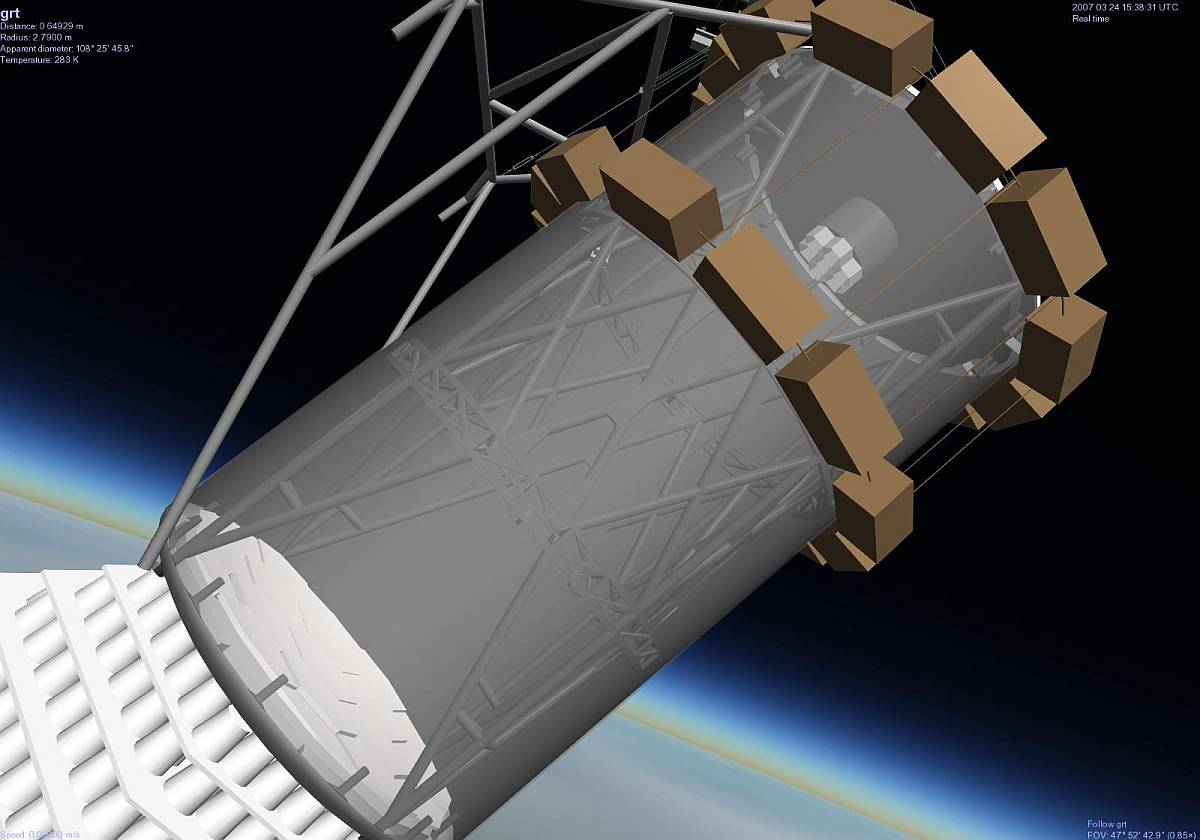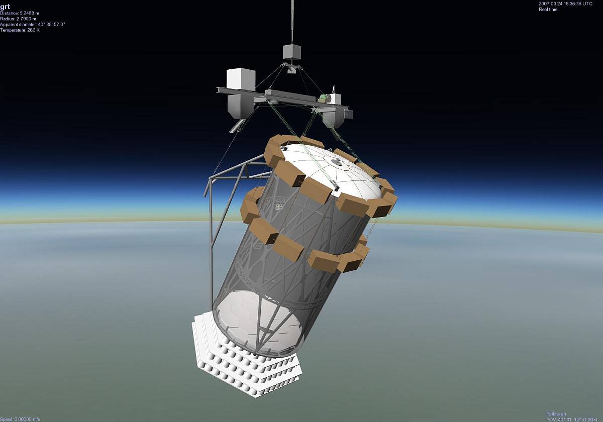 The external estructure of the instrument was protected by two crush pad systems: one formed by several layers of styrofoam cups placed under the bottom head and the other consisting of two rings of cardboard honeycomb placed around the outside near the top. This allowed to protect the instrument at landing even if the telescope toppled over. The weight of the telescope, without crush pad and pointing-system, was 2.600 lbs and the total weight of the scientific package was 3.400 lbs.
