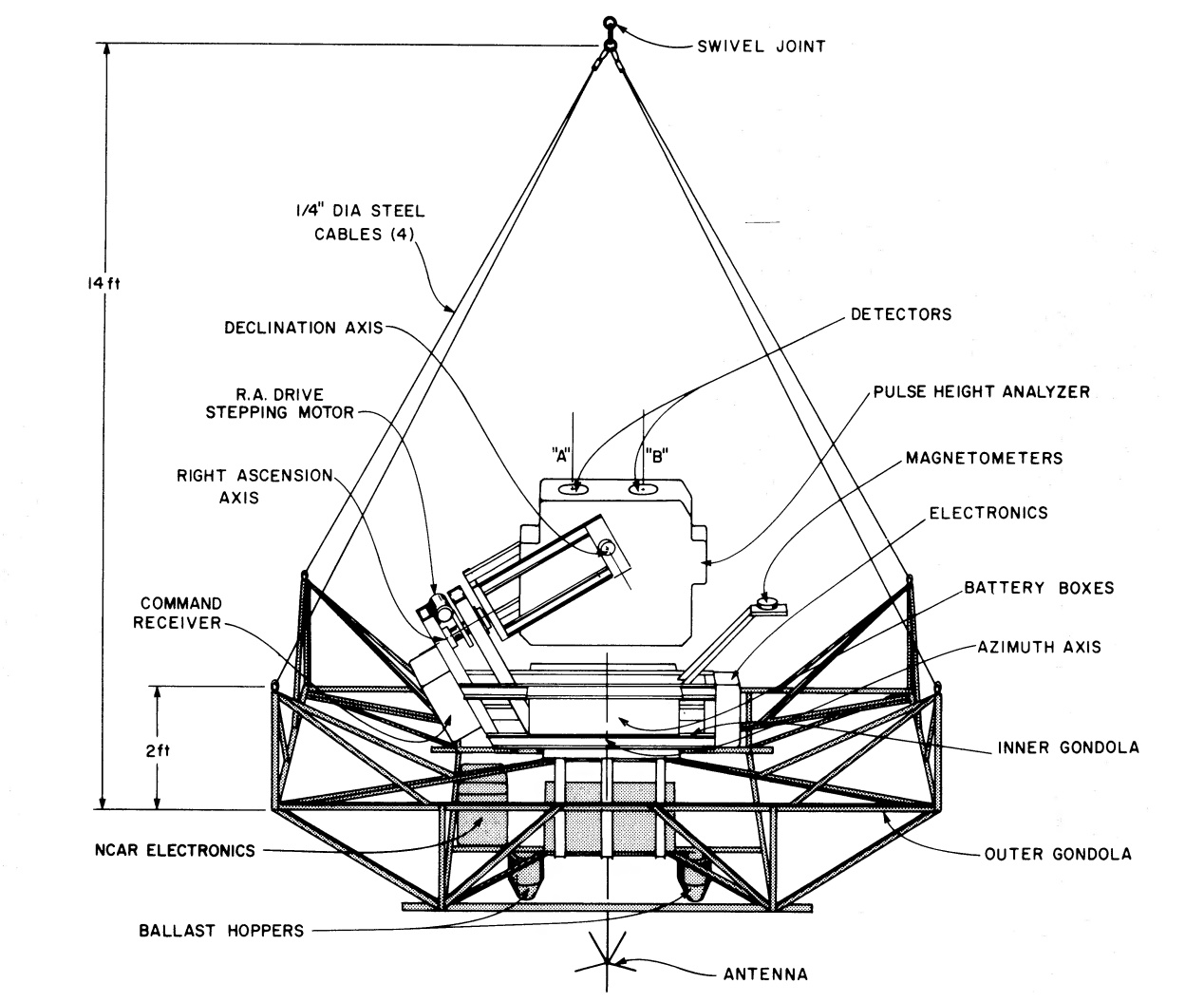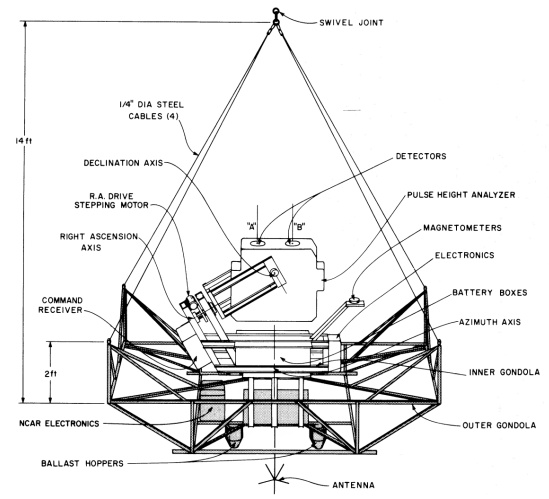 The detectors were mounted in parallel within an equatorial telescope configuration inside an inner gondola capable of azimuthal rotation relative to an outer gondola. The outer gondola, suspended by four cables from the balloon, stabilized along the local vertical, while the inner gondola rotated to track celestial objects. Pointing was managed by a servo system guided by flux-gate magnetometers, which aligned the telescopes polar axis with the Earth's rotation axis, with pre-launch adjustments for latitude and magnetic declination.