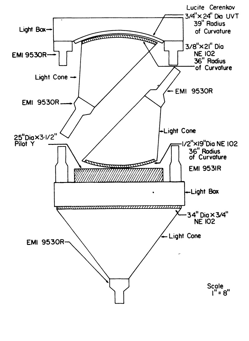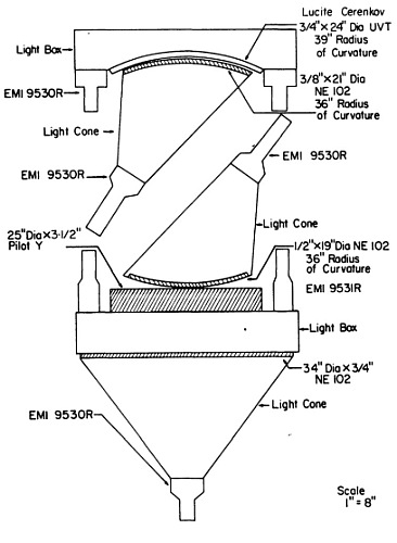 An outline drawing of the telescope is shown at left (click to enlarge). The telescope consisted of a Cerenkov counter to measure the particle's velocity, two scintillation counters to measure the particle's de/dx, a total energy counter (E), followed by a third scintillator. A comparison of the outputs of the various counters permits the determination of the particle's charge and energy and of its mass as well over the range of energies for which the particles stop in the E detector. The experiment was an evolution of a similar instrument flown in 1970 and 1971 but with the addition of the new total E counter for isotope resolution. The telescope has a geometrical factor of 548 sr cm2. Each of the five elements of the telescope was pulse height analyzed separately using linear 4096 channel analyzers. Scientific data wass telemetered by a separate data link monitored by the personnel from the University of New Hampshire.