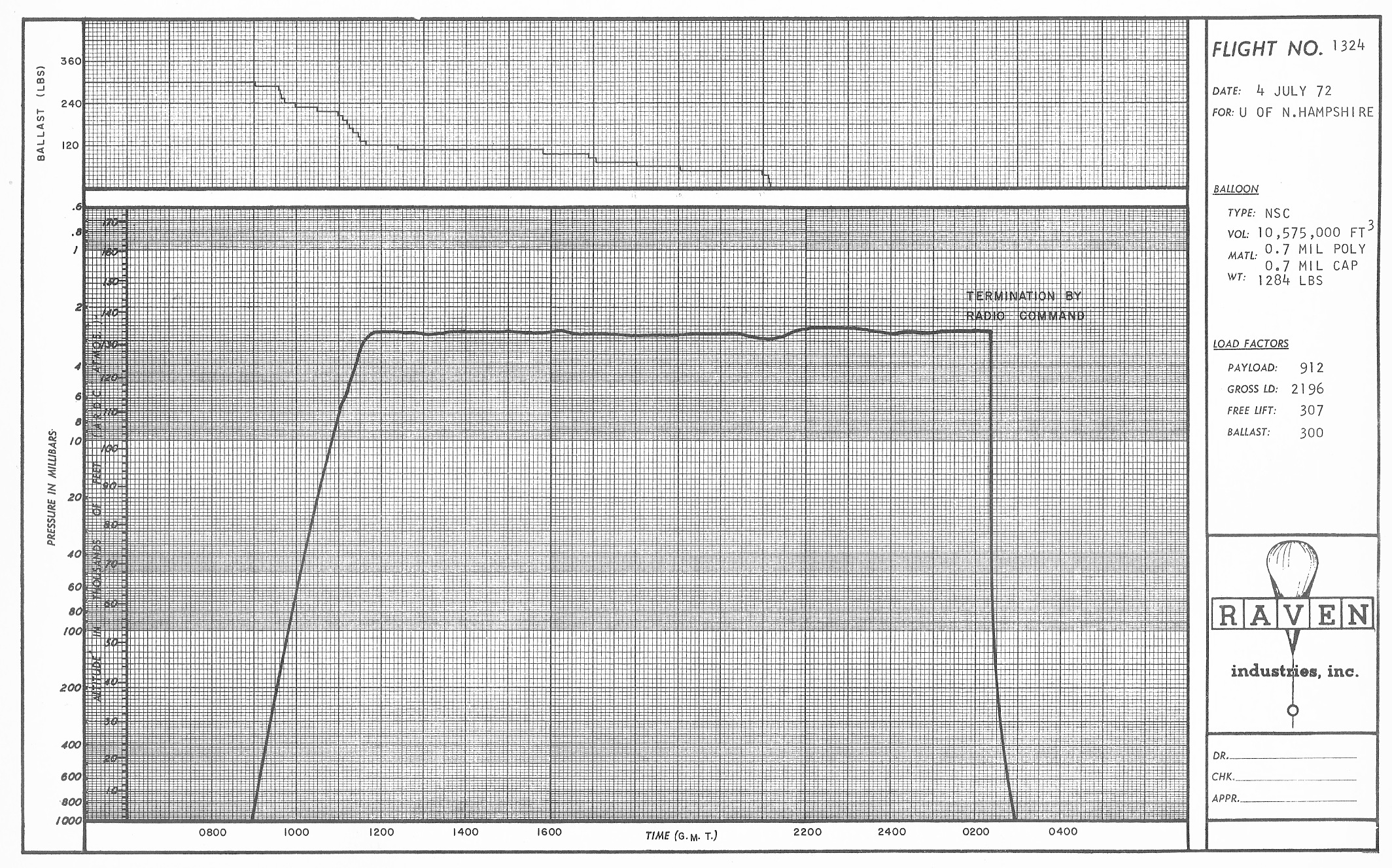 The balloon was launched by dynamic method at 8:56 utc on July 4, 1972 from the airstrip in Fort Churchill airport. Launch was performed smoothly in nine knot surface wind. The balloon ascended at 1000 fpm from launch to 80,000 feet, with several ballast drops near the tropopause. Floating altitude was 137,000 feet. After floating 14 hours and 40 minutes, the flight was terminated from a Cessna 206 float plane, with impact occurring 44 minutes later.