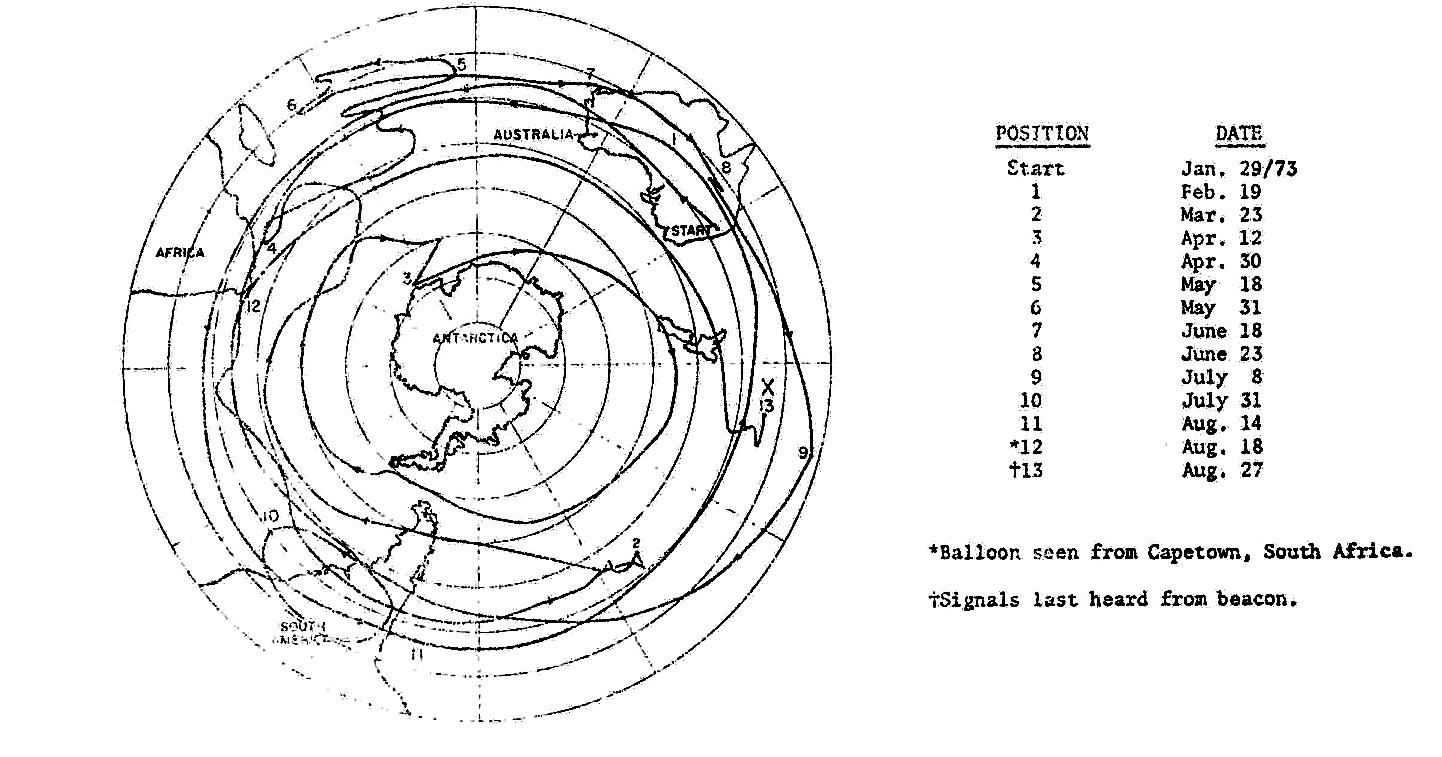 The balloon was finally launched on January 29, 1973 from the Oakey Air Base near Brisbane, Australia. It was anticipated that Magellan would float at 80,000 ft., be recovered after one orbit 15 to 25 days after launch, and that the balloon would last to a maximum of 100 days. For various reasons, recovery was not attempted on the completion of the first orbit. A major effort to terminate the flight in the third week in June was unsuccessful partly because of the inaccuarcy in establishing the balloon's position and partly because of the failure of the battery pack which had not been designed for the prolonged flight. During the last days of the flight scientist were concerned about the balloon being knocked down by a nuclear blast performed by French authorities over Mururoa at the time of the balloon passing.