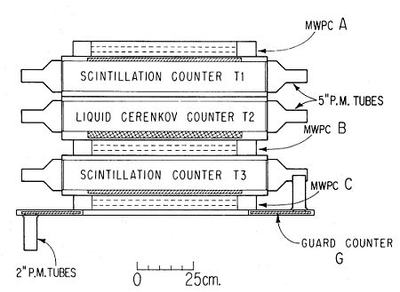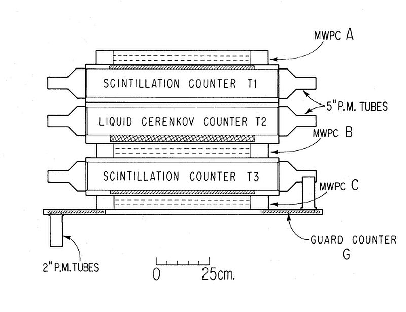 A guard counter, labeled G, was included to help eliminate background signals originating from secondary interactions in the atmosphere. This counter was a plastic scintillator (NE 110) shaped as an annulus, and its pulse height was recorded for every event. High-energy background events or side showers typically produced significantly larger signals in the guard counter, enabling their exclusion during data analysis.