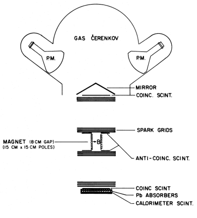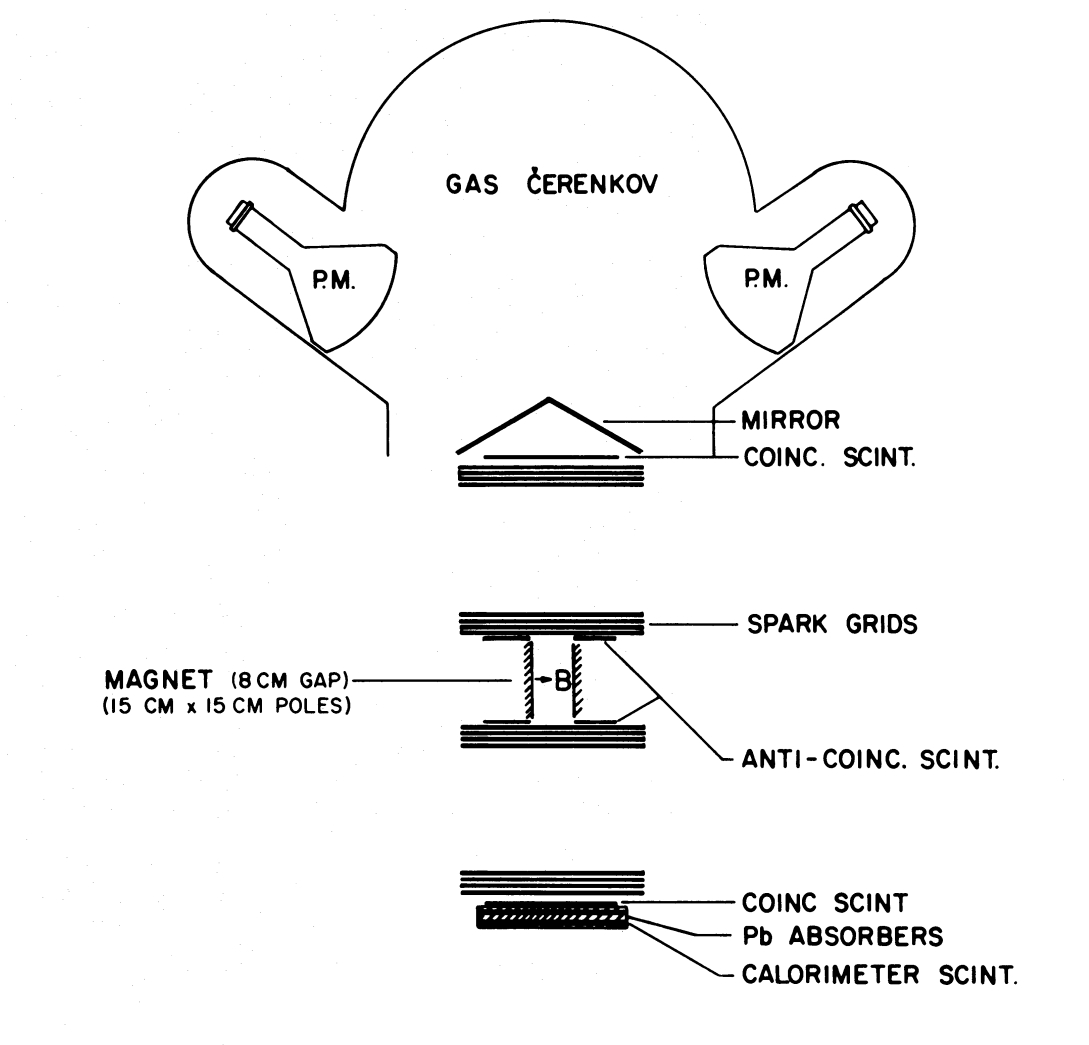 The apparatus -which can be seen in the scheme at left- was triggered by a counter telescope consisting of a directional gas Cerenkov counter and two plastic scintillation counters. Two anti-coincidence scintillation counters were used to veto events in which a particle failed to pass through the magnet gap. The Cerenkov counter contained Freon-12 at 1 atmosphere pressure, which provided an energy threshold of about 21 mc² for a particle of mass m. The gas Cerenkov counter was insensitive to all protons and heavier nuclei with rigidities in the range of interest as well as all upward moving particles within the telescope aperture.