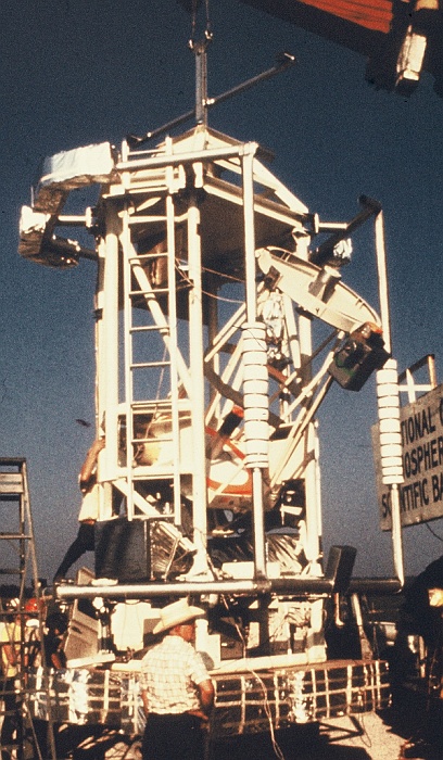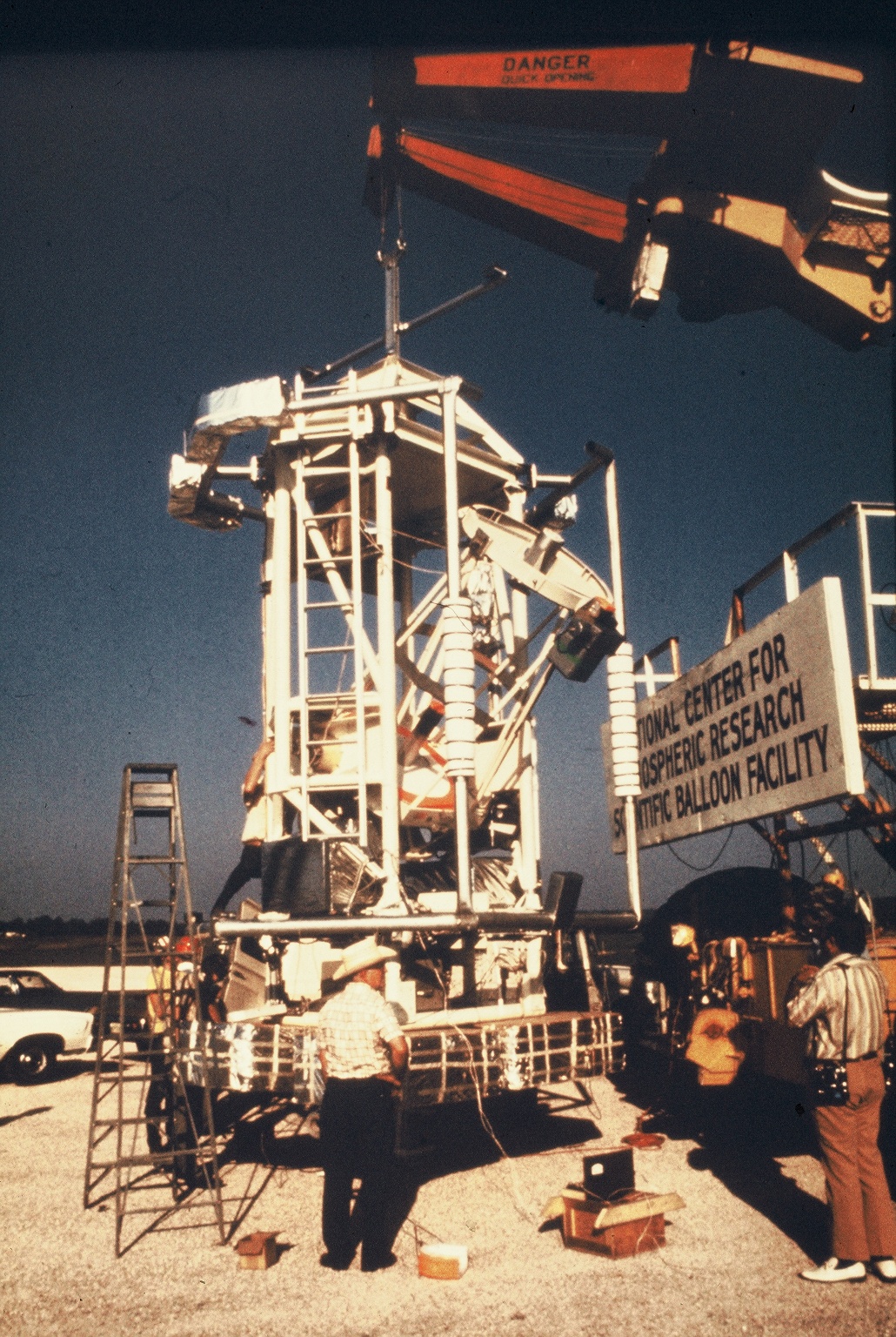 The telescope was mounted in a rectangular aluminum-frame gondola 5.1 m high and 3.4 X 2.9 m wide. Heavy structural elements were used throughout the central portion of the gondola to maintain the integrity of the telescope tube, the elevation and azimuth axes, and the payload electronics. The instrument was stabilized and pointed by means of positional servo controls on the elevation and azimuth axes. The entire gondola moved in azimuth, but the telescope motion in the elevation direction was with respect to the gondola frame. The driving element for each axis was a DC torque motor mounted directly on the axis without gearing. In elevation, the reaction mass was the main frame of the suspended gondola. Reaction forces for the azimuth position control were provided by a large reaction wheel mounted on the gondola center line below the telescope. Also to control the reaction-wheel speed and to isolate the gondola from balloon rotations the system used a "momentum dump" device. The main power for the payload was supplied by silver zinc batteries pack. The entire system weighted approximately 1814 kg.