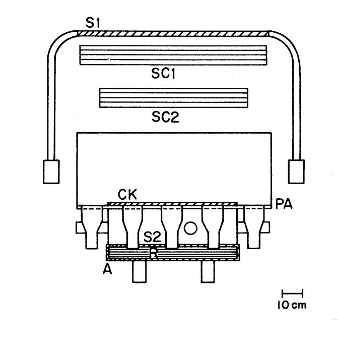A large-area, precision Cerenkov detector, labeled CK, was used in conjunction with the scintillation measurements to determine particle charge and speed. Mass was determined from the range measurement using range-energy formulae.