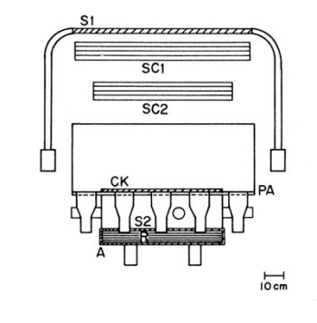 A cross section of the IRIS telescope appears in the figure at left (click to enlarge). Range was measured with a stack, labeled R, consisting of 330 sheets of Lexan polycarbonate plastic track detector each 127 µm thick. Particles which stoped in the range stack were identified with events observed in the active detectors using trajectory information provided by optical spark chambers SCI and SC2. The long lever arm between the spark chambers and the range stack enabled a precise determination of trajectory used in correcting the detector pulse heights and range measurement. A passive aluminum absorber labeled PA provided a uniform nonhydrogenous material in which a large part of the slowing took place. Organic plastic scintillators SI and S2 were used to measure energy loss, and to define the geometry of the instrument. An anticoincidence scintillator, labeled A, eliminated from analysis penetrating particles (for which no range measurement was possible) and particles which suffered nuclear interactions in the telescope, creating light, highly penetrating, charged fragments.