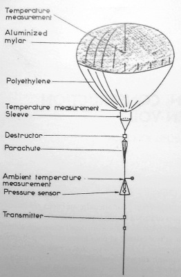 At left we can see an scheme of the flight train of the first test flights of the MIR (click to enlarge). The balloon had a volume of 5.800 cubic meters and was composed by a top part of 12 micron polyester film (Mylar) absorbent in the infrared, aluminized on its outer face and for the bottom a 15-micron transparent polyethylene film. The shape chosen was the same used on open stratospheric balloons, the so called natural shape that resembled an inverted teardrop. An opening stiffened by a fiberglass hoop was installed at the neck of the balloon to let the air in. The thickness of the films was standard to avoid any problems of supply and manufacturing. A band of a special type of ribbon was used to join at the equator of the balloon the different materials of each of the halves.