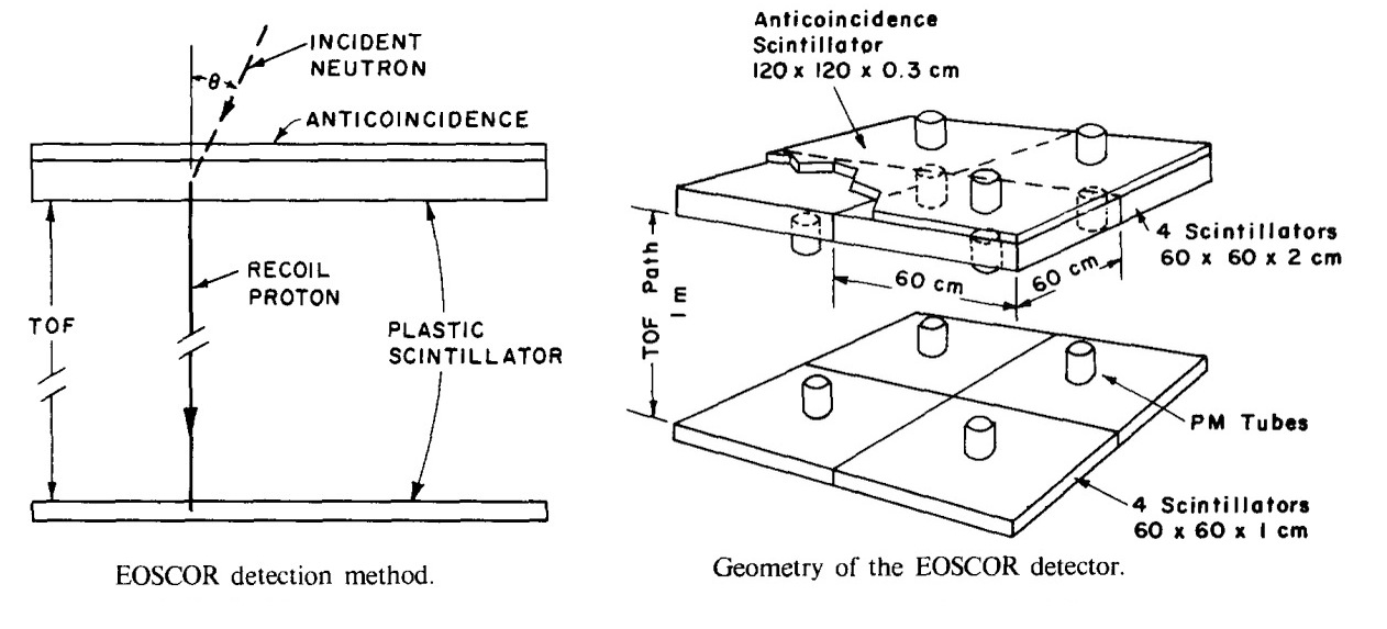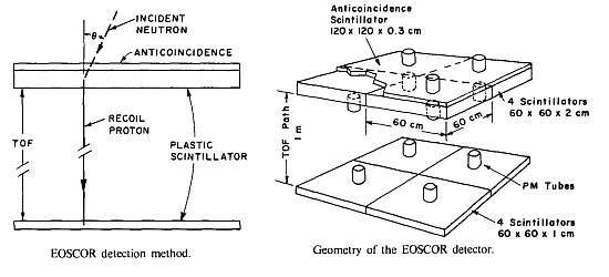 In the scheme at left we can see an scheme of the detector (click to enlarge). EOSCOR was composed by two scintillators separated by a 1 meter time-of-flight (TOF) path. Neutrons incident on the detector produced protons via scatterings and interactions in the upper scintillator. TOF was then used to discriminate the slower moving proton recoils from the copious relativistic Compton electrons generated by the atmospheric and cosmic gamma-radiation. Complete protection against data contamination by charged particle induced events was provided by veto counters placed above the upper scintillator and below the lower scintillator. The energy loss in the upper scintillator and the proton's velocity (as determined from the TOF measurement) were combined to give the energy of the proton recoil. Solar neutron events were then characterized by an increase in the neutron counting rate over the atmospheric background, correlated in time with a flare. Since the gondola orientation and the position of the sun were known, the incident neutron energy could be determined from the measured proton energy by simple scattering kinematics.