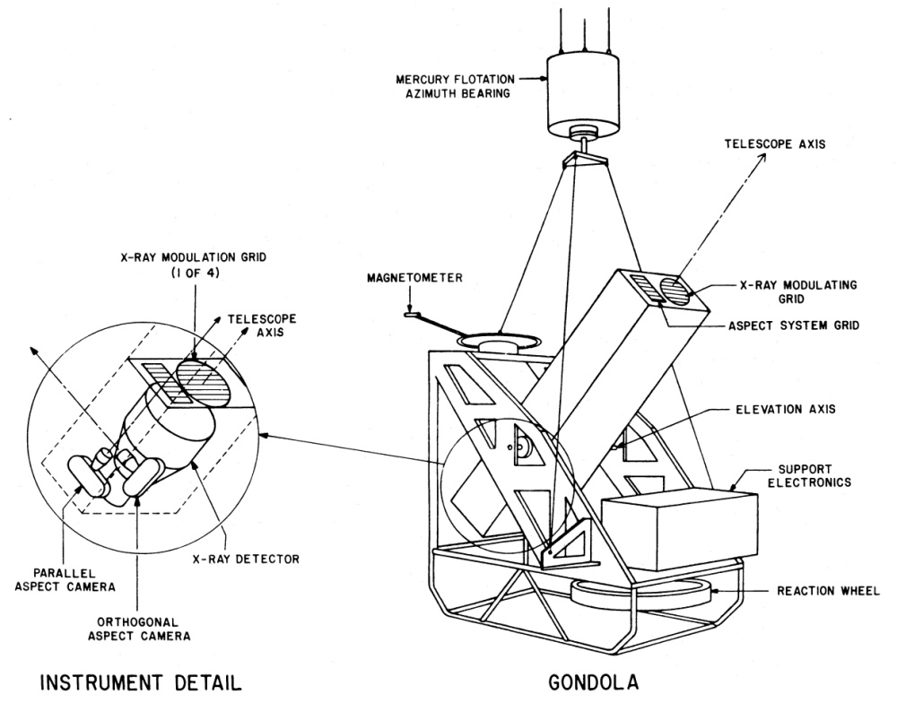 The instrument can be seen schematically in the image at left (click to more details). It consisted of a multigrid modulation collimator, a stellar aspect system, and a phoswich scintillation detector, all mounted within an alt-azimuth gimbal on a balloon gondola to ensure continuous source tracking with an accuracy of about 0.1°. The collimator itself had four grid layers, each with an area of roughly 580 cm², a transparency of about 48%, and a total thickness of 1.0 mm. Each layer was composed of ten 0.1 mm-thick photoetched invar sheets with a 300 µm mesh pitch, stacked together inside a 1.5 m-long, temperature-stable invar structure. Its angular response produced fan-beam transmission bands of 22 arcseconds full width at half maximum, repeating every 164 arcseconds. The alignment of the grids was adjusted to within about 5 µm using optical diffraction and X-ray shadowgraph methods, and their mechanical and thermal stability was carefully verified before flight.